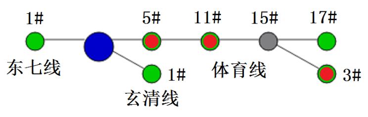 在2015-05-29 12:33:40 PS區(qū)內(nèi)經(jīng)2000歐姆接地試驗(yàn)中,故障線路體育線單相接地故障點(diǎn)之前的故障監(jiān)測(cè)點(diǎn)為:體育線5#桿、11#桿、體育線15#支3#桿,如下圖所示,其余為非故障監(jiān)測(cè)點(diǎn)。