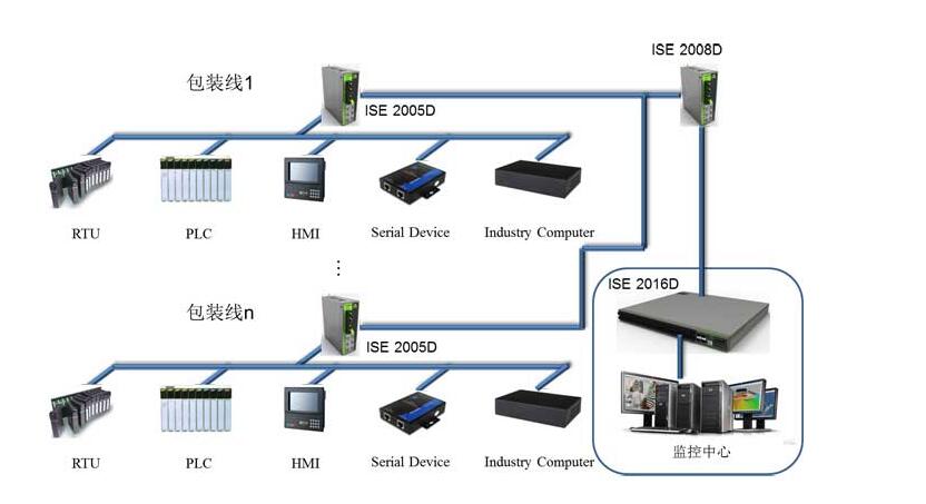包裝生產線現場一般只有少數人員操作維護,很多監(jiān)督和控制需要遠程接入完成,支持以太網的設備裝置可以通過這個網絡進行通信,并且工廠現場的其他工藝設備也可以通過轉換端口接入網絡。